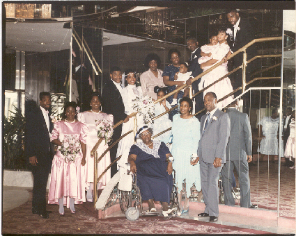 Four generations of the Adams/Spivey family attended the wedding of my niece in July, 1990. This is a photo I am particularly proud of since it shows four generations of the same family. My mom, Maggie Adams Spivey, is seated in a wheelchair [front row], and the mother and father of the bride are standing beside her. |